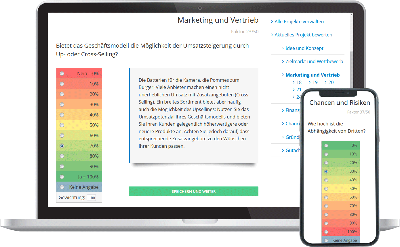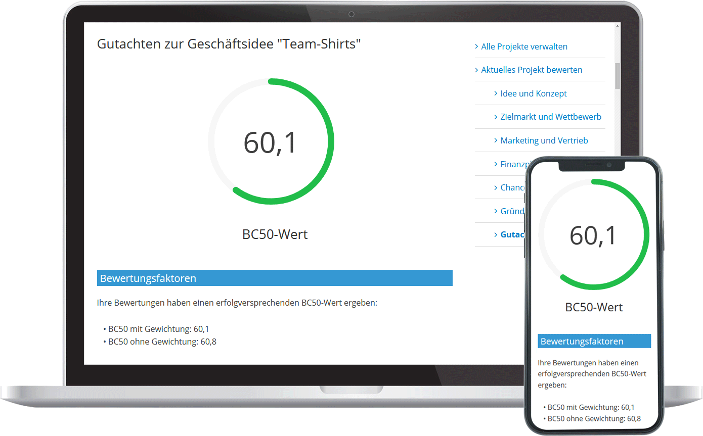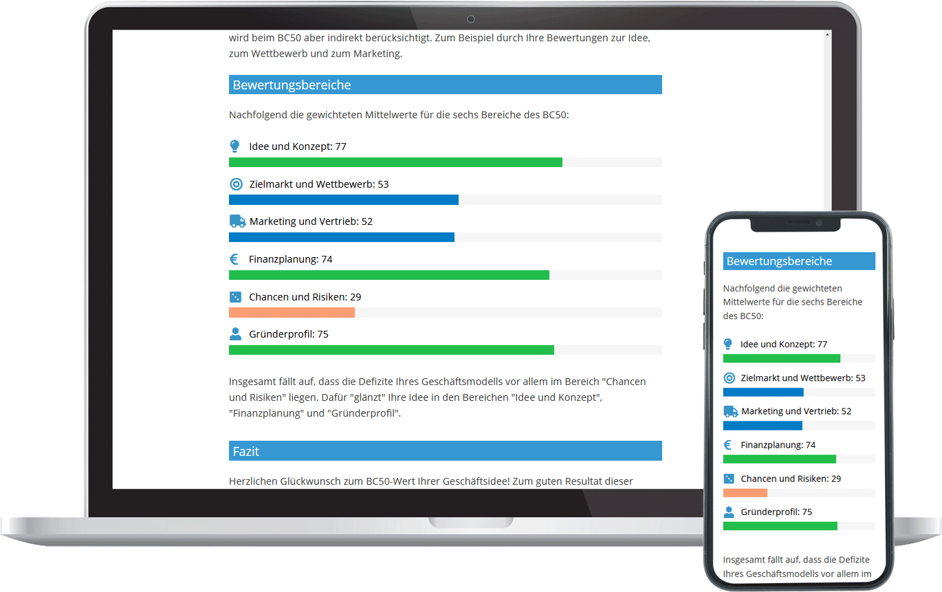 Direkt nach der Bewertung der Faktoren erhalten Sie eine Auswertung Ihrer Geschäftsidee in Form eines Gutachtens. Die Analyse erfolgt durch einen Algorithmus, der Ihre Bewertungen exakt und individuell berücksichtigt.
